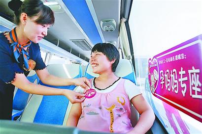總站南區(qū)的工作人員告訴記者,在總站南區(qū)乘車的孕媽媽們都可免費領(lǐng)取到徽章,并可憑徽章享受總站南區(qū)專為孕媽媽提供的優(yōu)先購票、優(yōu)先咨詢、優(yōu)先檢票、優(yōu)先乘車等服務(wù);在距離總服務(wù)臺不到兩米的地方便是總站南區(qū)專為孕媽媽設(shè)立的孕媽媽候車專區(qū)。記者看到,坐席上全都鋪著竹涼席,后面是一臺五匹的立式空調(diào),還有免費的飲用水,旁邊的閱報欄里擺滿了可免費閱讀的報紙以及雜志。
